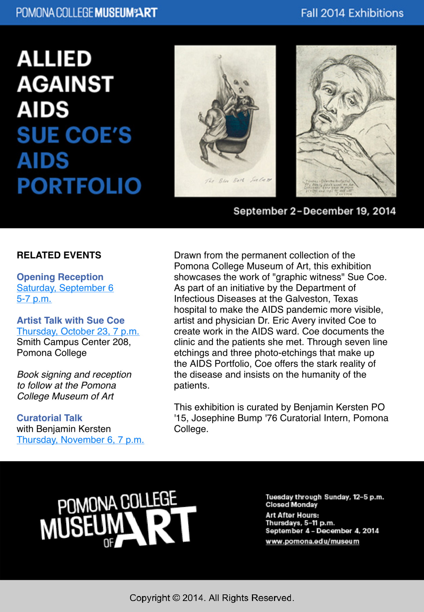 Pomona College Museum of Art Announces Opening of Allied Against AIDS: Sue Coe’s AIDS Portfolio August 14, 2014 · by Jessica H. · in Events. · Share this: Click to share on X (Opens in new window) X Click to share on Facebook (Opens in new window) Facebook Like Loading... Related