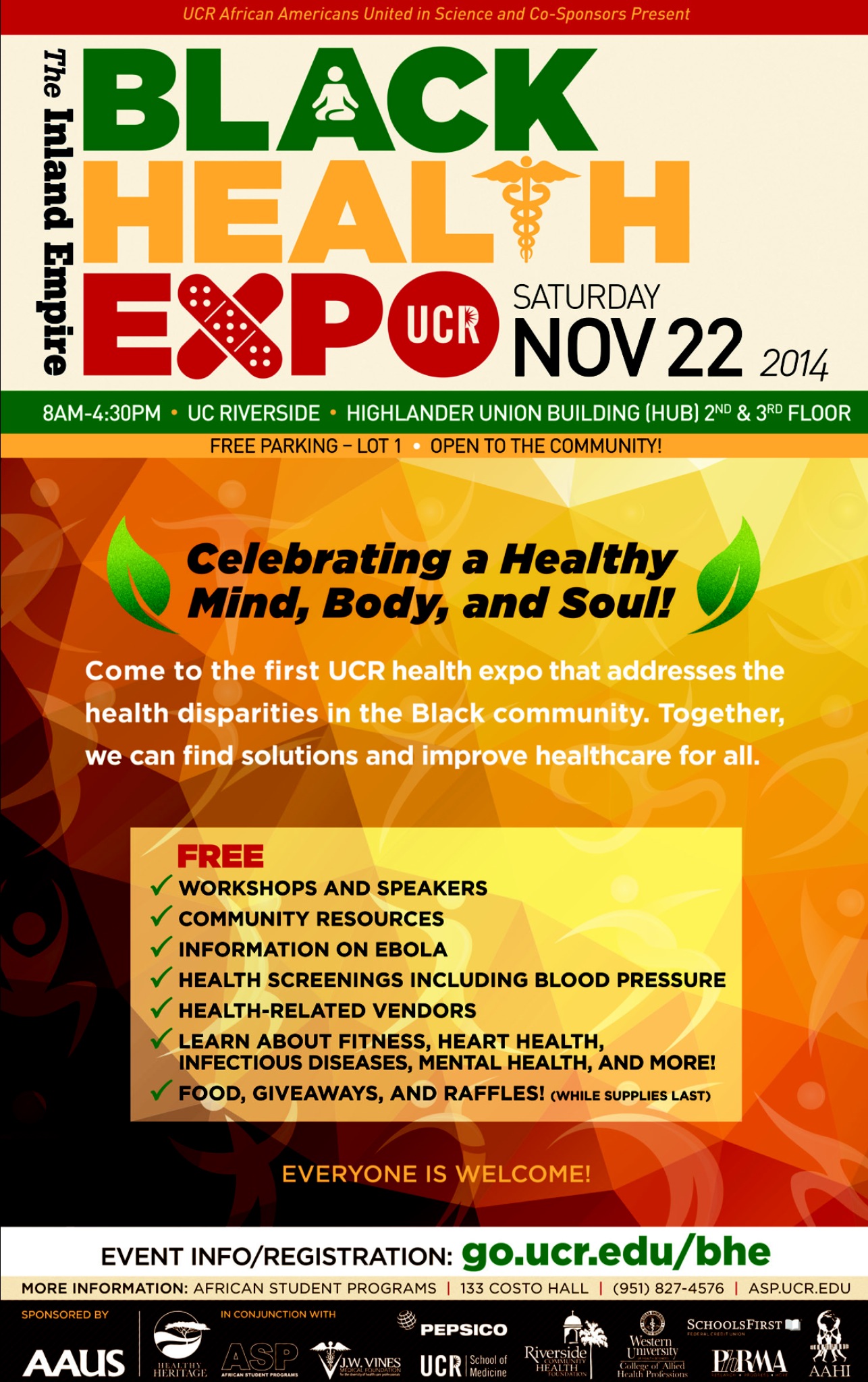 Black Health Expo – Saturday, November 22 November 14, 2014 · by Jessica H. · in Events. · “Come to the first UCR health expo that addresses the health disparities in the Black community. Together, we can find solutions and improve healthcare for all” Share this: Click to share on X (Opens in new window) X Click to share on Facebook (Opens in new window) Facebook Like Loading... Related